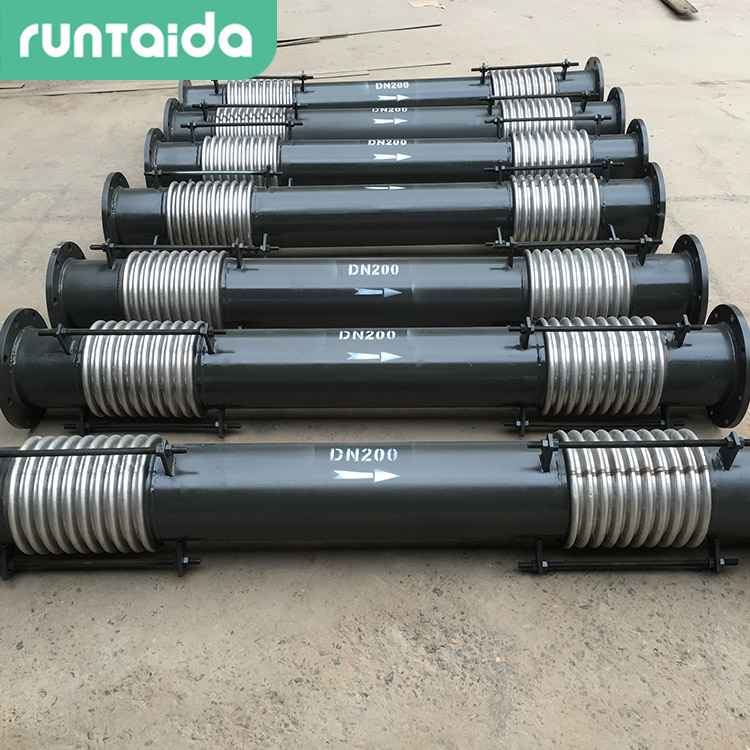 由中間管所連接的兩個波紋管及拉桿、端板和球面與錐面墊圈等結(jié)構(gòu)件組成,主要吸收橫向位移,也可用于補償軸向、橫向、角向以及由這三種形式合成的任意方向的位移。推薦使用將復式拉桿型膨脹節(jié)安裝在呈90°的Z形管道的中間短管臂內(nèi)以補償兩端長管線軸向位移。
